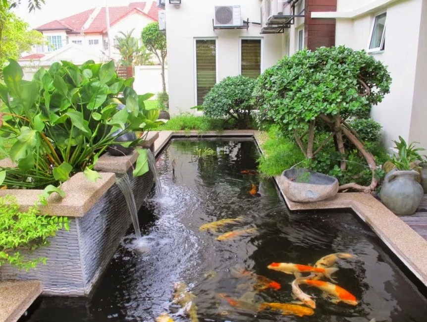 Hopefully, you are interested in the design of this garden next to the house with this fish pond design, and you can make your dreams come true.