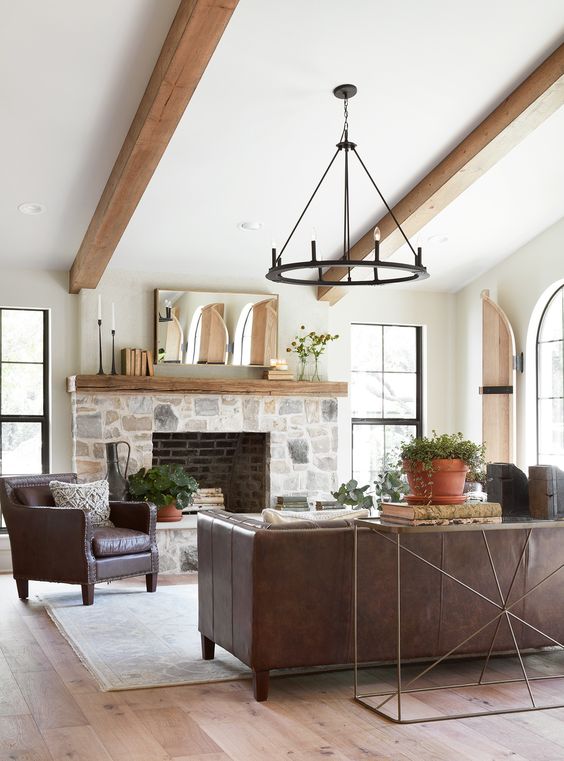 On the walls where the fireplace is given the natural stone to give texture to the room so that the room looks attractive. Wood elements are also used for ceilings, beams, and floors.