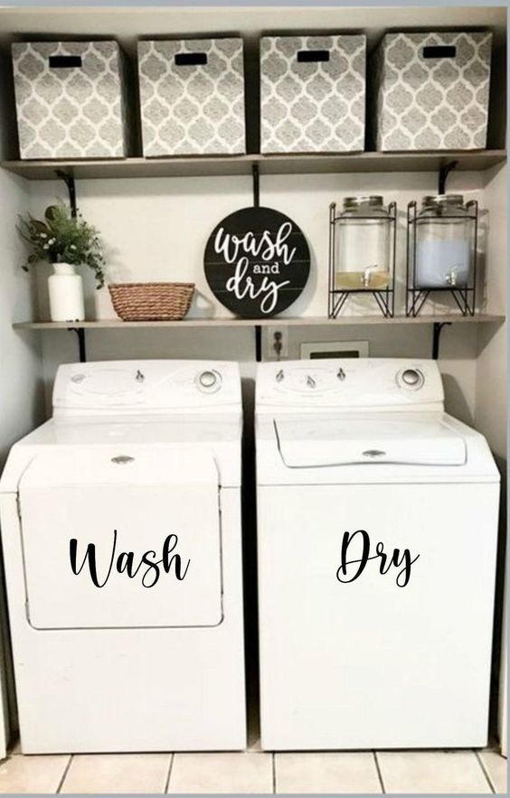 And for smart storage, you can use a wall cabinet with a door. In this way, the stuff that you put in the cabinet will not look so that the laundry room will look neat. You can also hang the rod between the cabinets to hang up some of your damp clothes.