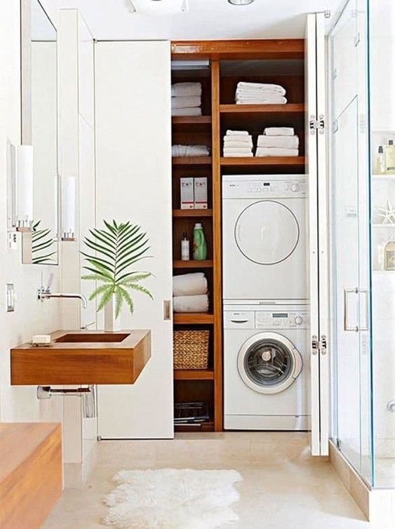 Showing the laundry room in the bathroom probably can make your guests feel uncomfortable. Therefore, a bedroom washer and dryer in the bathroom with pocket doors will be a great idea you could apply to.