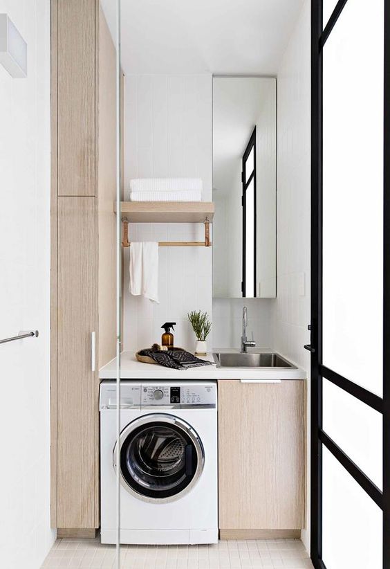 Because a narrow room is better to avoid using shelves and cabinets. Try to use the side of the wall as a medium to put some laundry stuff.