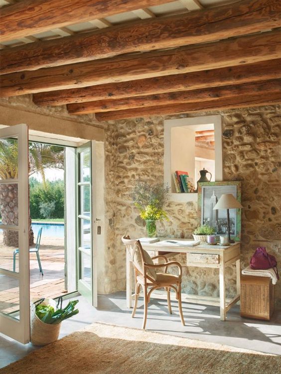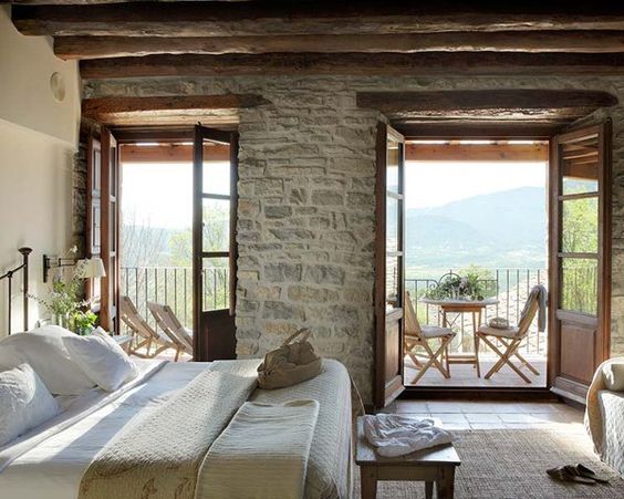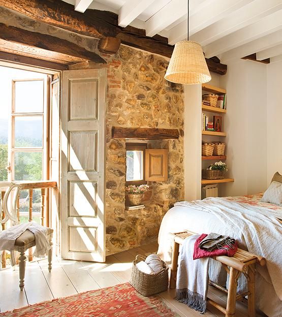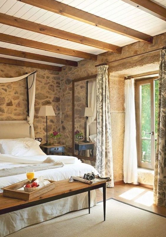 Natural lighting, natural stones wall, and wood beam ceiling look so integrated and work together in making the bedroom the most comfortable room at home. You can feel the calming natural atmosphere clearly.