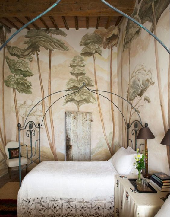 Bringing natural landscapes into the bedroom is not an impossible thing. With an old-looking wall tree mural, it is perfect for beautifying a simple Italian-style bedroom.
