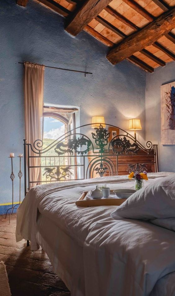 Blue Italian-Style Bedroom with Vintage Bed Frame