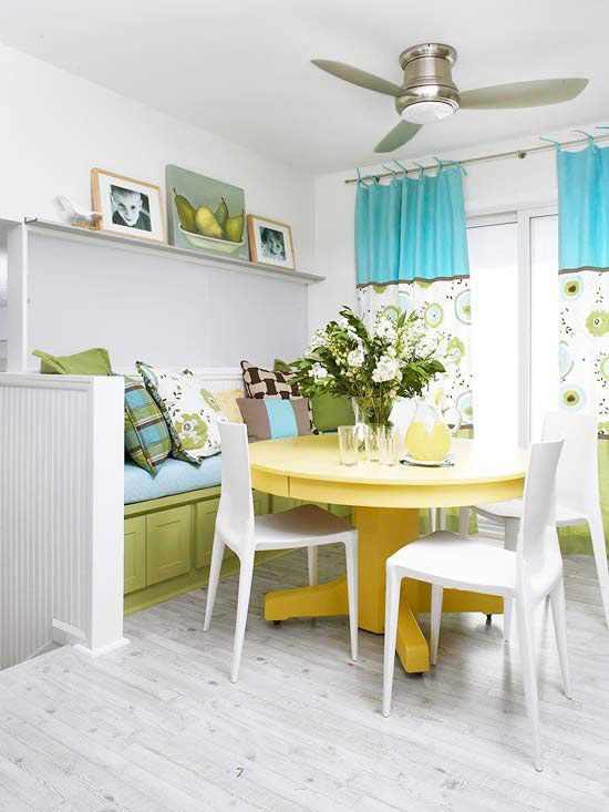 In applying bright and cheerful colors, try to apply them to just a few accents. Applying these colors too much will also make the dining room look weird.