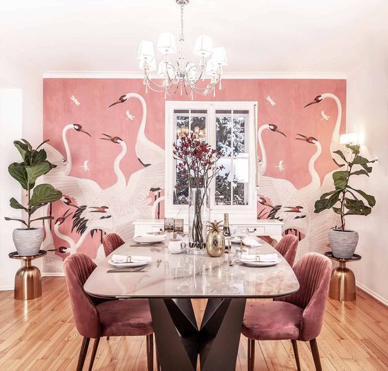 So, the next tip and trick in creating a cheerful ambiance in the dining room are to apply the beautiful wall mural. There are many kinds of wall murals that you can apply to the dining room walls.