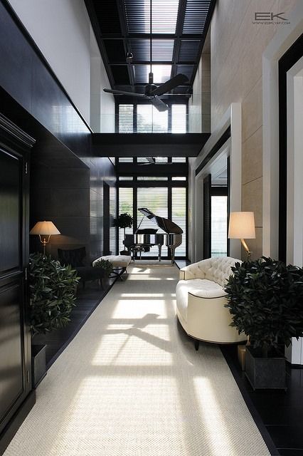 The Manchester sofa is the most appropriate type of sofa to make a living room look luxurious. Warm lighting is also the right decoration to give a warm and comfortable luxury look. Not only that, the hallway living room also looks fabulous with the ivory white carpet that is held along the hallway.