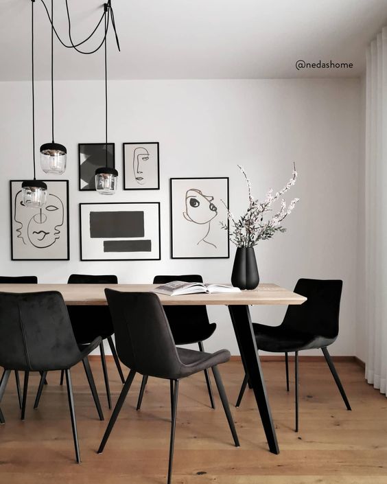 The gallery wall is an idea that can be applied to a monochrome dining room so that this room looks more attractive. Old photos that B&W prints out will look like they are worn out. In fact, these photos will make the dining room a room full of memories.