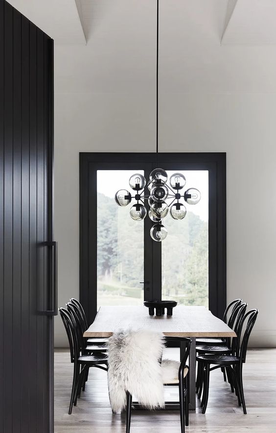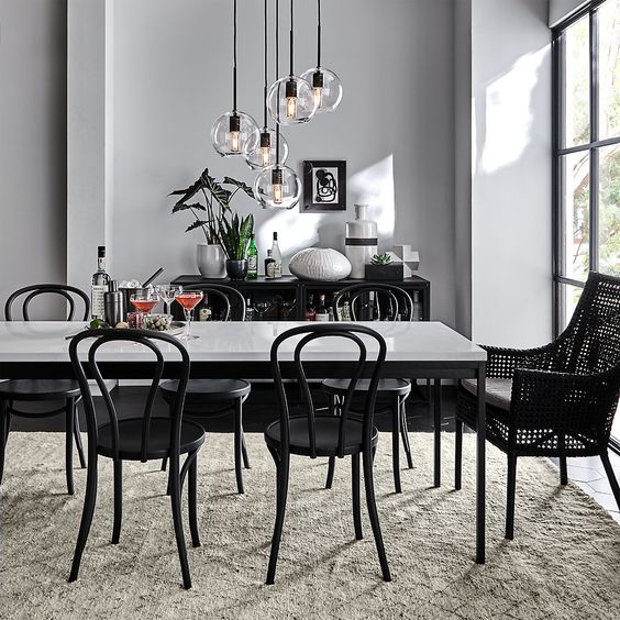 For a simple look, the exposed bulb pendant lamp is a pendant lamp type that can be chosen to make the monochrome dining room look more attractive.