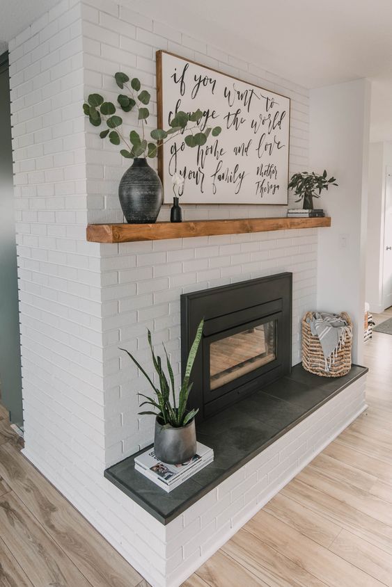Adding a big picture with beautiful writing on top of the fireplace is an interesting idea to make the fireplace look more attractive. The white picture is the right choice to make it look more dominant when hung on the wall above the fireplace.