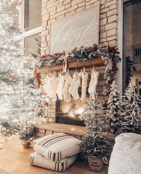 Several socks hanging on the fireplace make the fireplace look very attractive. Adding some Christmas items to the fireplace is also the right decoration in making the fireplace look more beautiful.