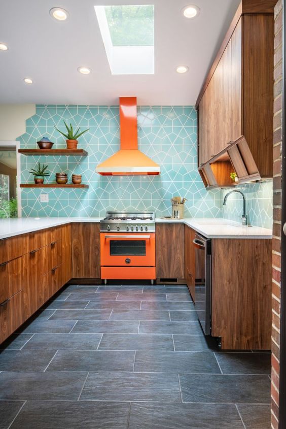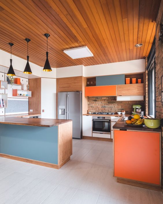 As seen in the picture above, the use of bright colors is not applied scattered across several kitchen spots, but rather focuses on one kitchen point.
