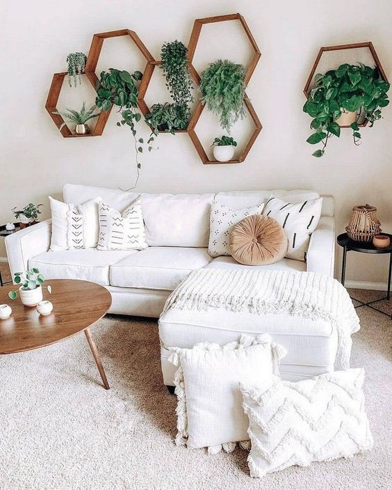 The floating wall shelf is the right item to use to decorate the living room wall with plants. The polygon-shaped floating wall shelf makes the living room look more attractive. You can also use the hanging plants if you do not want to use a floating wall shelf.
