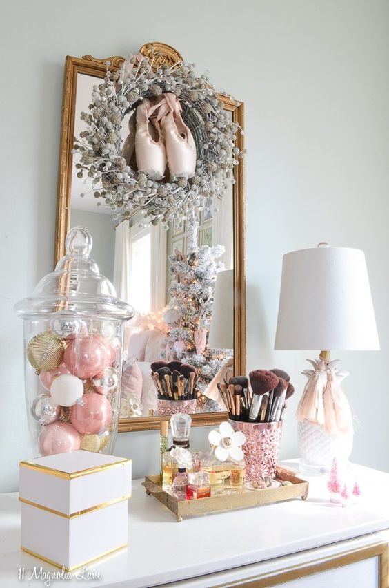 As in the picture below, you can see the decoration very clearly. However, the owner of the room still wants a feminine and elegant look. Therefore, some Christmas ornaments that were usually red or green were replaced with pink and gold. Pink for a feminine look to the bedroom and gold for an elegant and expensive look.