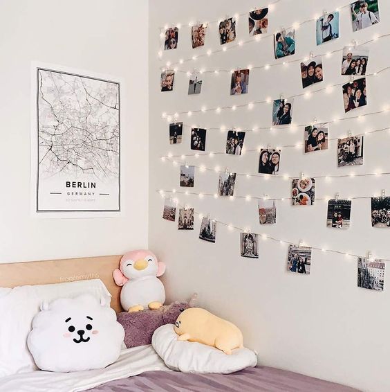 Have interesting and memorable photos? These photos would be very unfortunate if they were only stored in a drawer. These interesting and memorable photos can be used as a perfect decoration to make the string lights on the bed look more attractive.