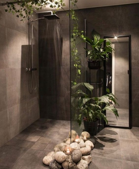 With the natural stone in the bathroom, you don’t need a lot of plants. To freshen up your bathroom, choose 2-3 plants. Hanging plants are the right plants to apply.