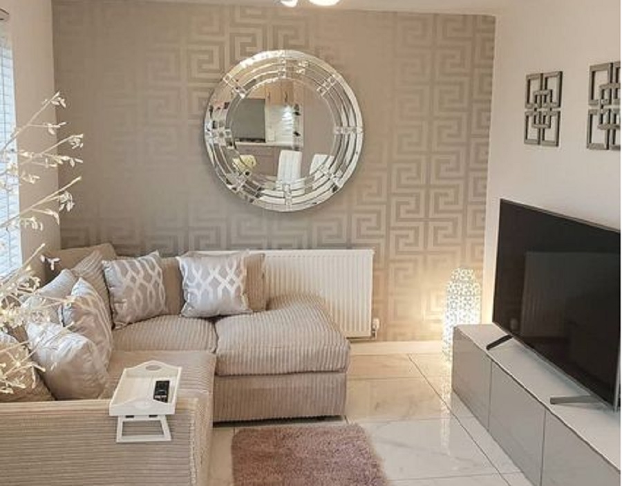You can see this living room looks small in size, but the luxurious feel can be seen from the appearance of the gold-colored wallpaper. If you want to make it look more luxurious, you can decorate the walls with beautiful wallpaper. Then, to look more attractive, give beautiful and shiny mirror accessories.