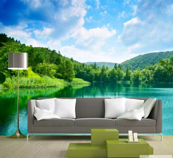 This motif has brought your soul to sleep and lulled with the beauty of nature. You will imagine how happy you are to be in this place. Then, imagine the beauty of lakes, mountains, and green grass areas. But don’t be too carried away by this wallpaper image because this is just a wallpaper motif made by a photographer who has skill and art. Then to make this room more attractive, you can place a gray sofa set and white sofa cushions like this picture to match the atmosphere of the room. Of course, this design can make your guests amazed in your living room, especially if your guests are happy with the view of the lake and mountains.