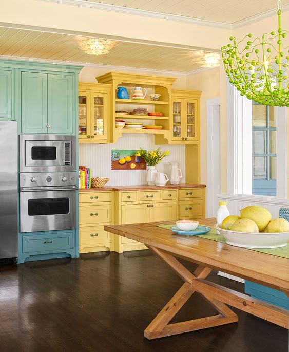 There are several bright colors that can be used and can be combined to make the right combination to make the kitchen feel cheerful but still look simple: