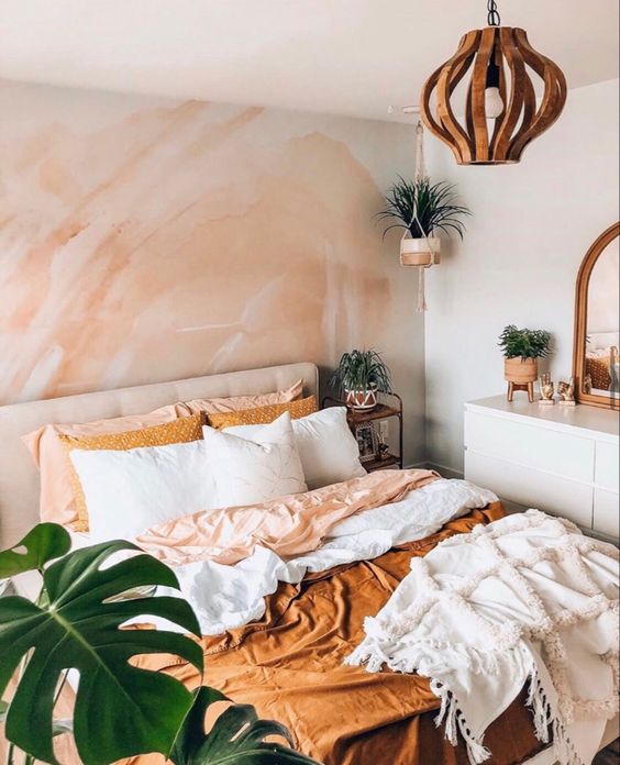 Applying a light orange color to the wall gives it an attractive and aesthetic look. The orange color on the pillowcases also looks so beautiful and makes the bedroom look simple.