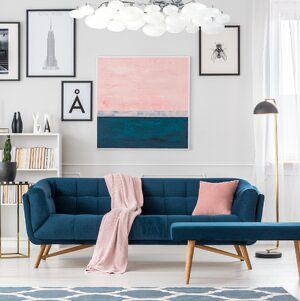 The pink color includes bright colors that can be used for the living room. A touch of pink in the form of a cushion and blanket on the navy blue sofa looks simple, sweet, and cheerful.