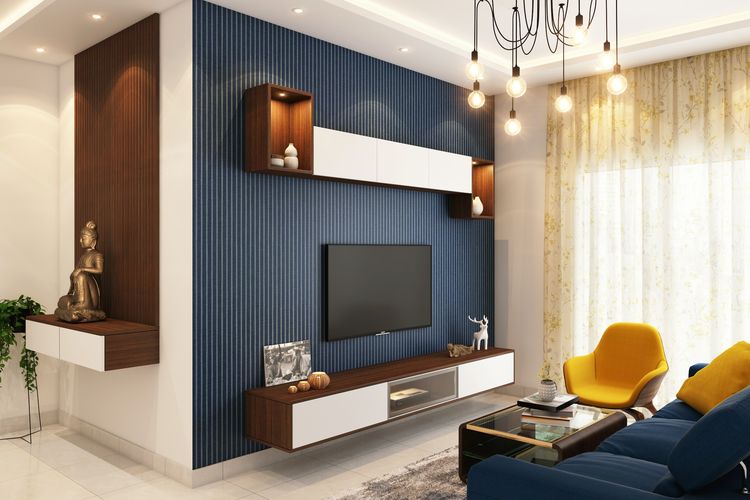 For example, you can see beautiful furniture like sofa sets and yellow chairs has placed in front of the television. Then you can see hanging shelves for accessories and hanging drawers for television equipment, living room wallpapers, beautiful curtains, television for family entertainment, and beautiful decorative lights.