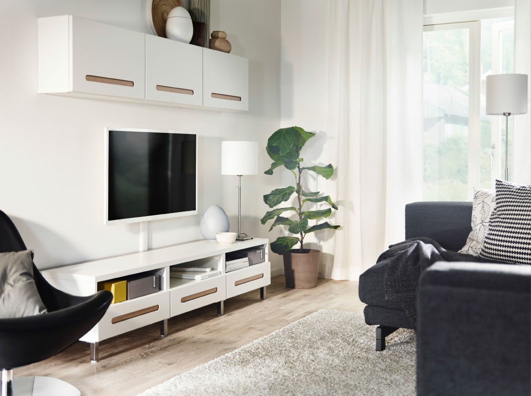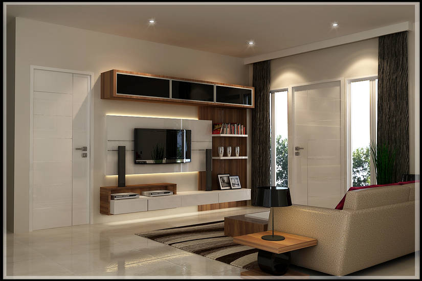 Then you look at white hanging shelves, white display cabinets, and televisions for family entertainment. Then to make the room more attractive, and has been decorated with white standing lamps, bright color curtains, soft carpet, and flowers.