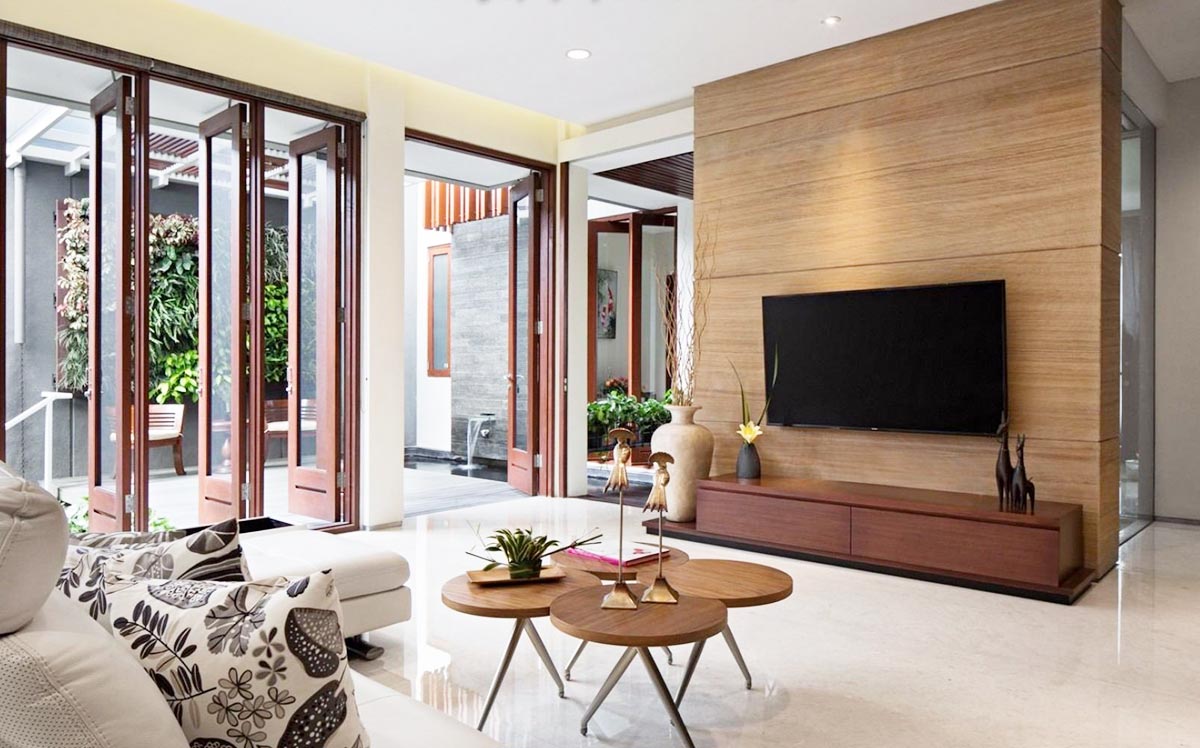 To making this room looks more attractive, this room is giving beautiful furniture. For example, you can see the walls of the television are using with brown plywood motifs. The furniture sets are complete with tables and beautiful room accessories.
