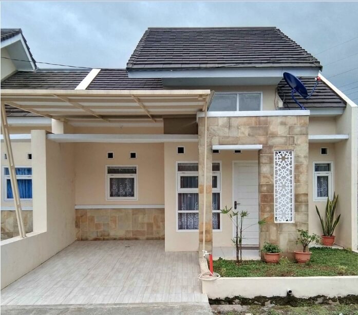 This one-story house has an exterior with white paint. Then, a minimalist style can be seen in this house. In addition to being painted white, some of the walls and pillars of the house apply natural stone, which is not bright in color.