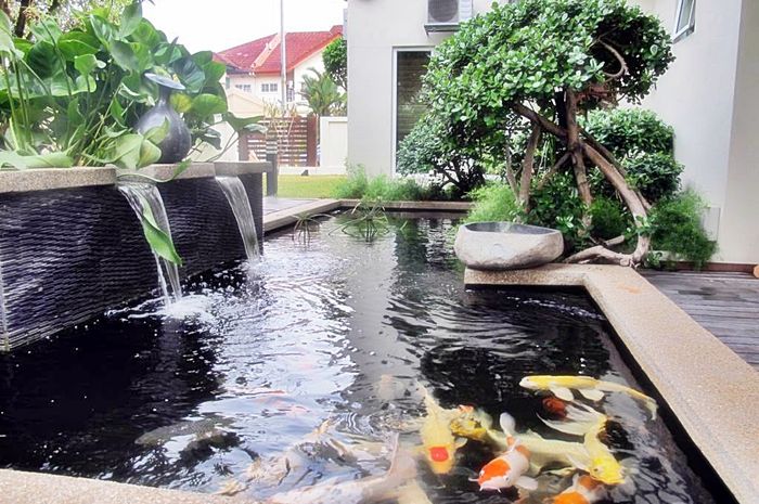 Then, you can see, the side garden of this house has decor with a fish pond, fountain, and flower pot, so the sound of water falling on the fish pond make the atmosphere of side your garden feel as natural as the mountain. Of course, you can put a patio chair in this place then chat with your family. Then, the trees in the park make the garden environment to be shady and comfortable.