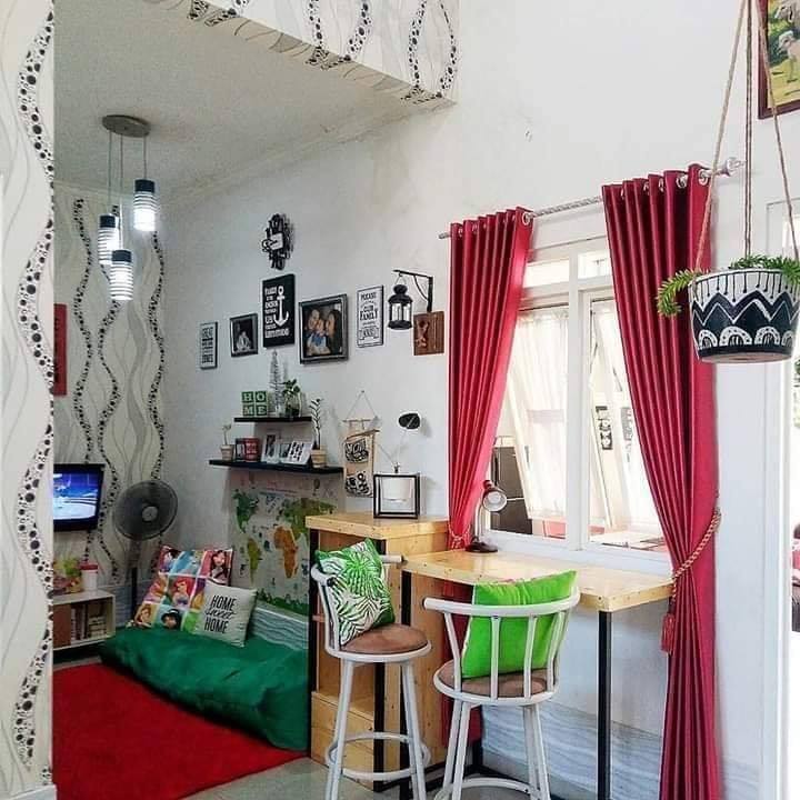 You can see the interior of this living room. The color combination of Red, Yellow, and Blue-Green Curtains in a Minimalist Living Room looks beautiful. For that, please choose window curtains that match the living room walls, don’t make the atmosphere of the view in the room uncomfortable. With a colorful design, your living room looks more beautiful and artistic.