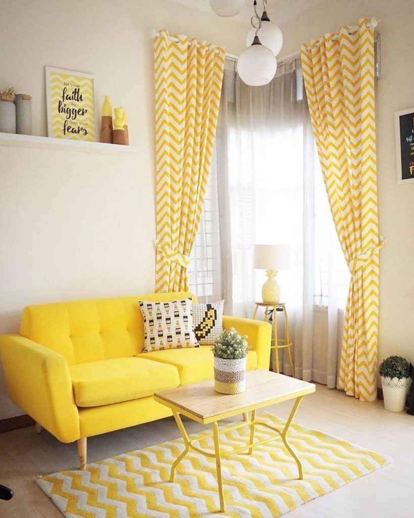 Look beautiful and elegant with yellow and white curtains hanging on the windows. The color matches the wall paint on the living room wall. If you have a living room interior like this, you can use a window curtain design like this picture.