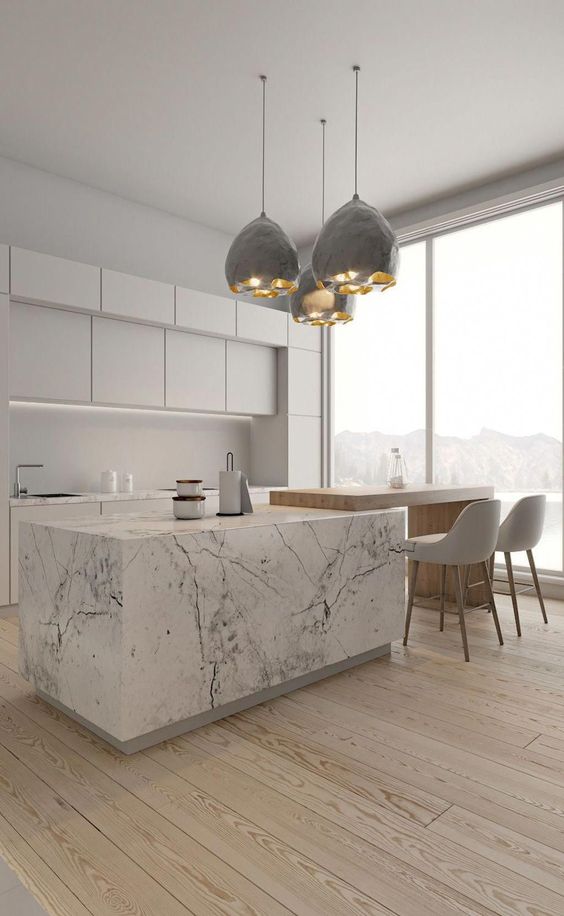 In the picture above, the Island table is made of marble material which greatly affects the appearance of the kitchen. The kitchen looks to be more classy and elegant.