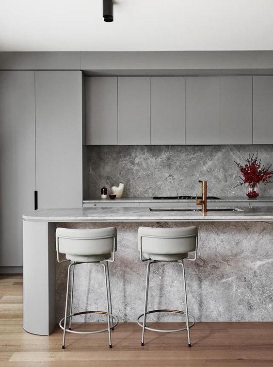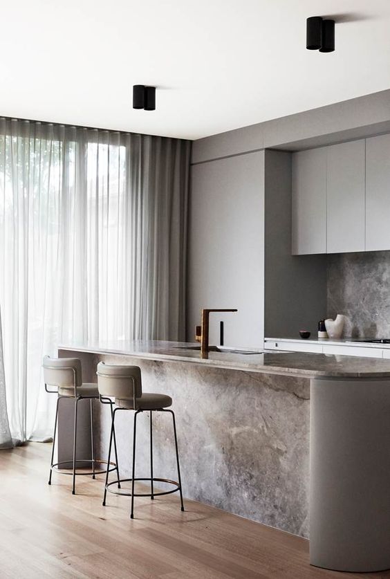 A little touch of marble on the kitchen walls is also an interesting idea to give a classy and luxurious look to a monochrome kitchen design.
