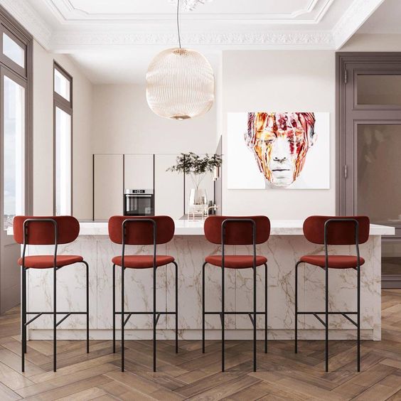 The touch of red as a decoration for the main kitchen makes it look so attractive. The red printed canva that hangs on the wall looks iconic in this room. The red printed canvas is the great art wall for a classy and minimalist kitchen with red touches.