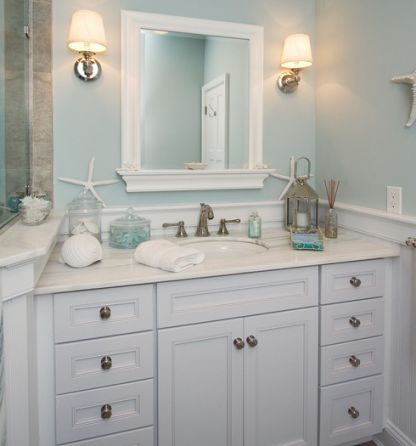 Applying coastal design to the bathroom is the most appropriate idea. The combination of light blue and white makes the bathroom look so fresh and calm. The blue color on the bathroom wall looks so fresh and beautiful. The bathroom sink table and white mirror frame look so harmonious.