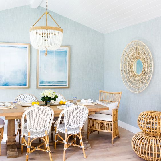 As shown in the picture above, the blue color makes the dining room atmosphere so calm. The addition of a marine painting emphasizes the coastal design to the room. The wall also looks so pretty with a mirror that is given a rattan on its side.