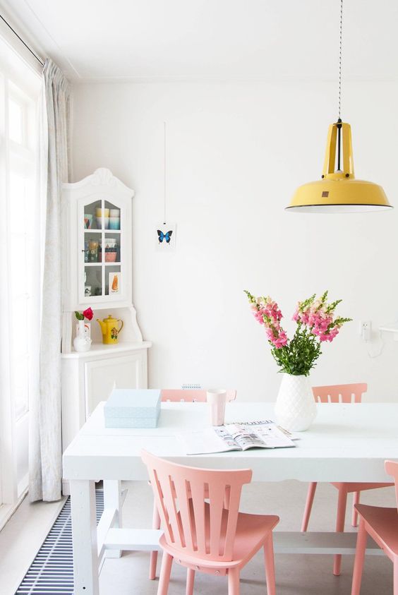 Sometimes pink is a color to avoid because it can make a room seem quirky and tacky. However, the use of pastel pink colors is actually very good for making the room look sweet and soft. Like in the dining room in the picture above, the pink pastel dining chair is the main item where it looks very dominant in this room. The appearance of the dining room looks cheerful and colorful but still looks simple and minimalist.