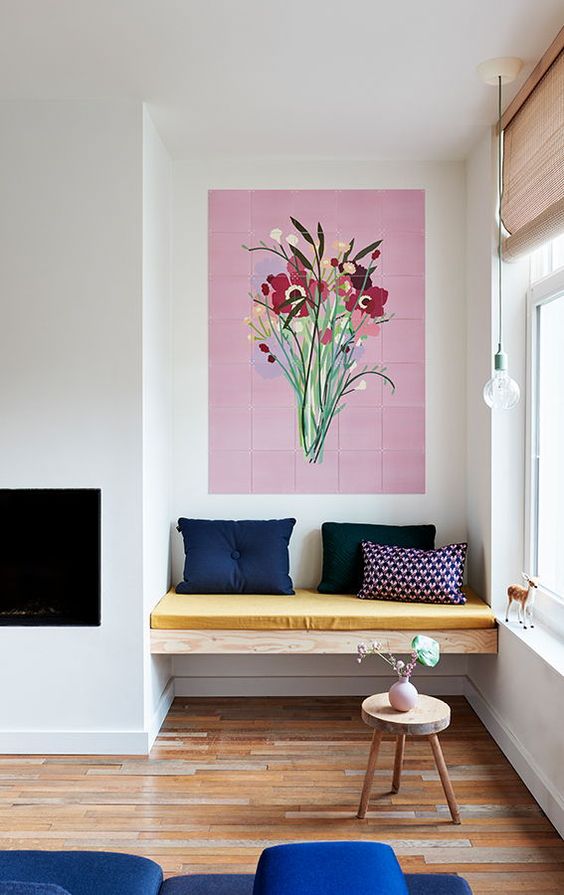The corner of the room near the window is the right spot to decorate so that it becomes the most comfortable spot in your house. As can be seen in the picture, console-style wooden benches are the right inspiration to maximize the use of the edge of the room. Providing a soft mattress on it can make the corner of the room the most comfortable spot. Several cushions with beautiful colors add to the beauty of the room itself. You can also feel the colorful appearance of the large pink painting with flowers hanging on the wall.