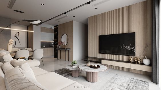 Timber arranged horizontally on the wall looks more attractive. The presence of cavities makes the living room look less rigid. Hanging the TV and mirror is the right way to make this wooden wall look dominant. The black TV provides a bold yet calming look.