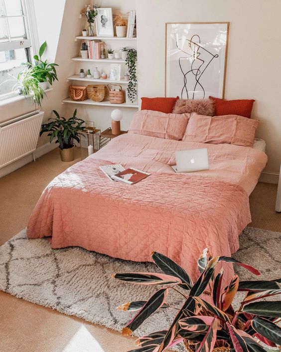 Giving a bright appearance to the bedroom in welcoming spring in 2021, peach color can be used as an option. The peach color is very suitable for application in women’s bedrooms. You will get a feminine, sweet, bright, and cheerful look from decorating a bedroom with peach colors.