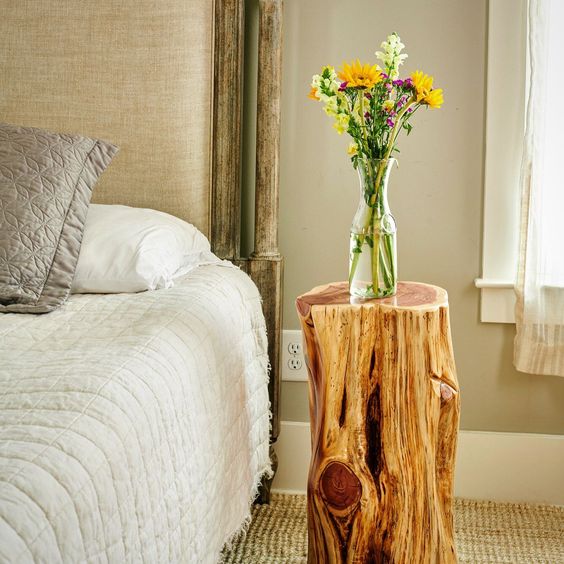 In welcoming spring 2021, what if you apply a natural concept to the bedroom? Decorating the bedroom with some natural furniture is very helpful to bring a fresh and alive atmosphere. And the tree stump as a side table can be used as an option.