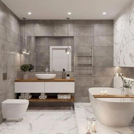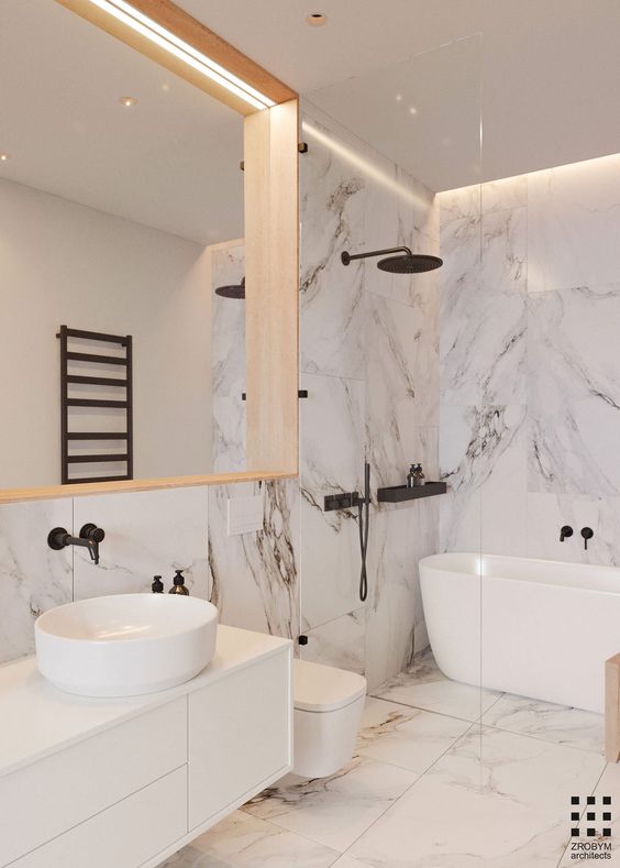 Recessed lighting is the right lighting to use for the bathroom with marble. Recessed lighting will provide a reflection on the marble so that the bathroom will look shining and elegant.