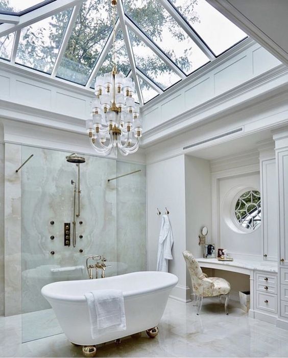 Skylight windows are perfect for bathrooms with marble floors. Natural lighting that comes in from the skylight window will directly hit the marble floor and make it look glowing so that the bathroom will look more elegant and bright.