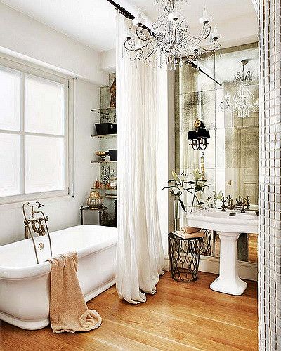 To give an elegant look to a vintage designed bathroom, mini small crystal chandeliers are the most appropriate lighting to use. Crystal chandeliers will make the bathroom look a little more glowing and look more luxurious.