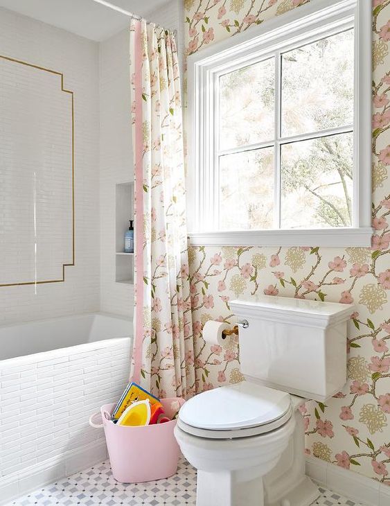 Besides being bright, the appearance of this design is also sweet and beautiful. Pink floral motifs are the most appropriate choice to bring the sweet and soft side as well as a simple feminine look into the bathroom.