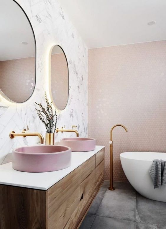 A Touch of Gold in the Pink Bathroom Makes It Look Elegant and Luxurious