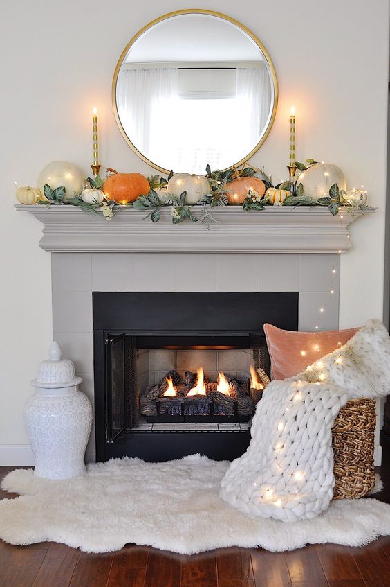 Adding one cushion to the rug or small chair is also a good idea to make the fireplace spot cozy. The fireplace display also looks more attractive with the addition of green plants and pumpkins on top. String light (Tumblr light) provides lighting that helps provide a warm which will make the living room feel so comfortable. In addition, the fireplace also looks more aesthetic.