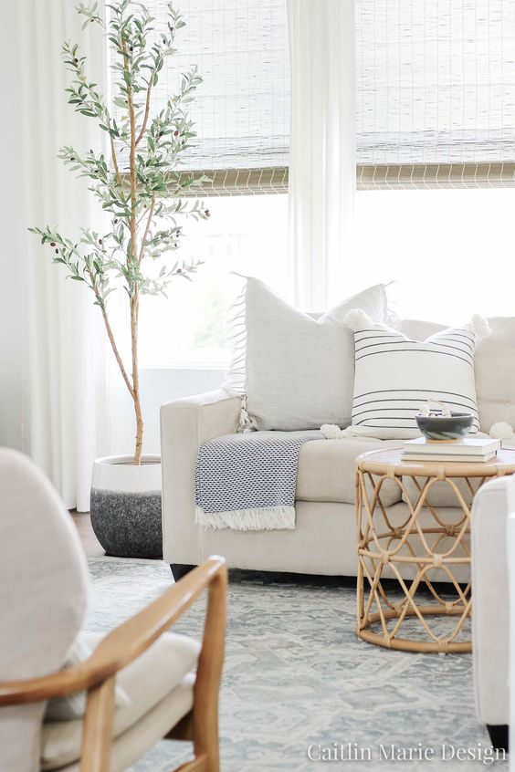 Sofas and tables are the main items in the living room. A white sofa is indeed able to make the room look bright and seem more spacious and comfortable. However, in Coastal design, warm nuances are so attached. This way, it is a good idea to use a table made of rattan to make the room feel warm and bright.