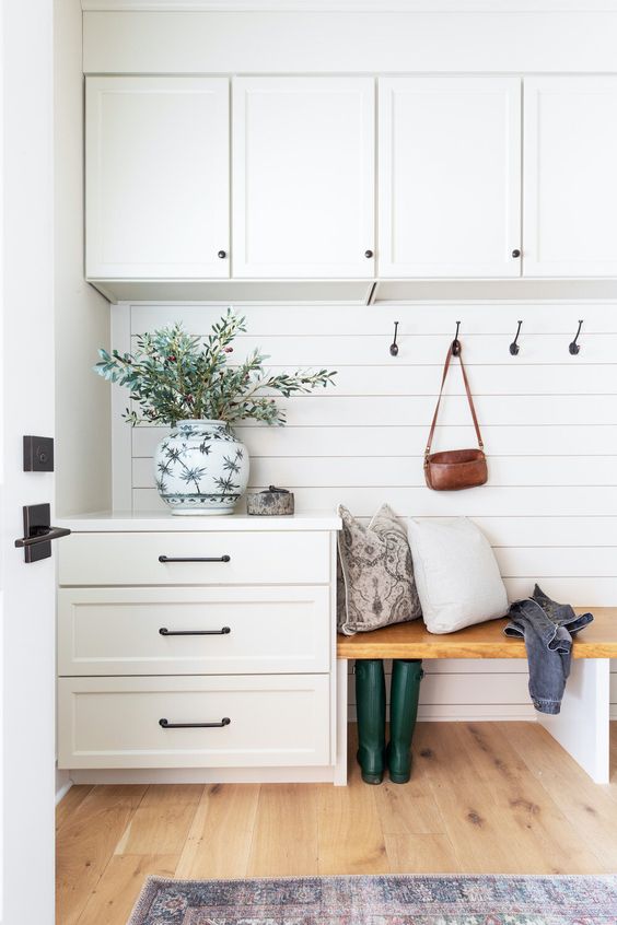 To save space in the mudroom, you can use a bench and use the bottom of the bench as a place to store shoes or sandals.